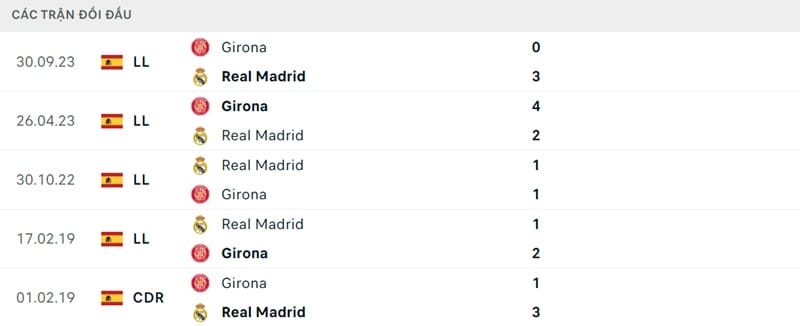 Thành tích đối đầu Real Madrid vs Girona: