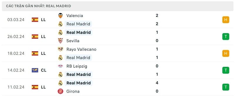 Ở trận đấu gần nhất, Real Madrid đã phải vô cùng vất vả mới có được kết quả hòa 2-2 trước Valencia. Dù vậy, Los Blancos không cần quá lo lắng bởi hai đối thủ cạnh tranh chức vô địch La Liga 2023/24 cùng họ là Girona và Barcelona cũng mất điểm ở vòng này. Real Madrid hiện có tổng cộng 66 điểm, hơn đội đứng nhì là Girona 7 điểm.