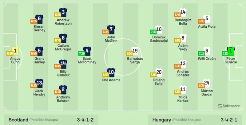 - Hungary: Gulacsi; Bolla, Orban, Dardai; Botka, Styles, Schafer, Kerkez; Sallai, Szoboszlai; Varga.