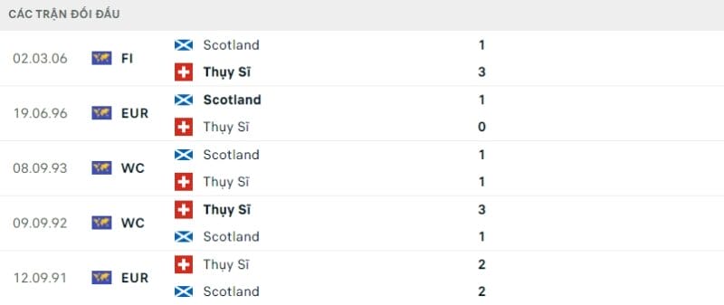 Thành tích đối đầu Scotland vs Thụy Sĩ