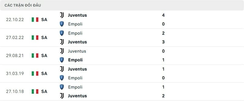 Thành tích đối đầu Empoli vs Juventus