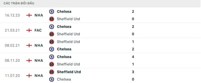 Thành tích đối đầu Sheffield United vs Chelsea