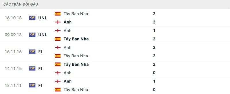 Thành tích đối đầu Tây Ban Nha vs Anh