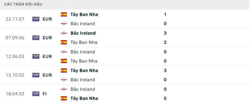 Thành tích đối đầu Tây Ban Nha vs Bắc Ireland
