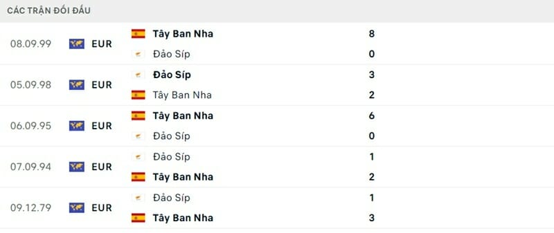 Thành tích đối đầu Tây Ban Nha vs Síp