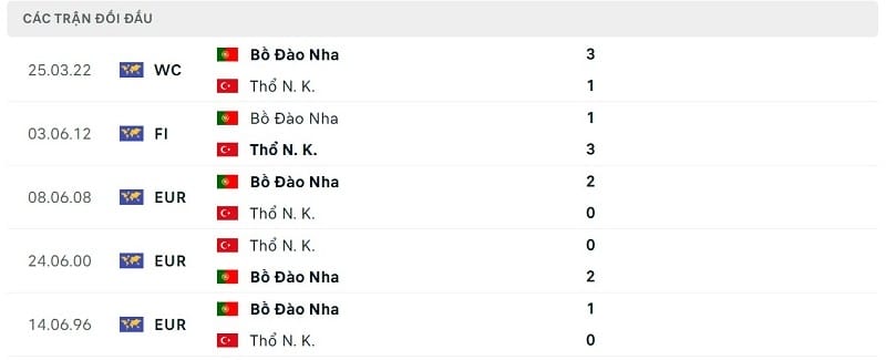 Thành tích đối đầu Thổ Nhĩ Kỳ vs Bồ Đào Nha
