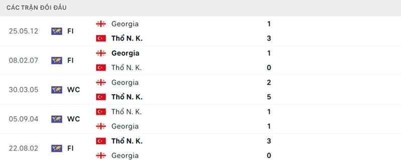 Thành tích đối đầu Thổ Nhĩ Kỳ vs Georgia