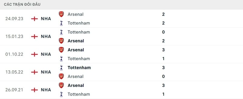 Thành tích đối đầu Tottenham vs Arsenal