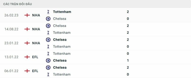 Thành tích đối đầu Tottenham vs Chelsea