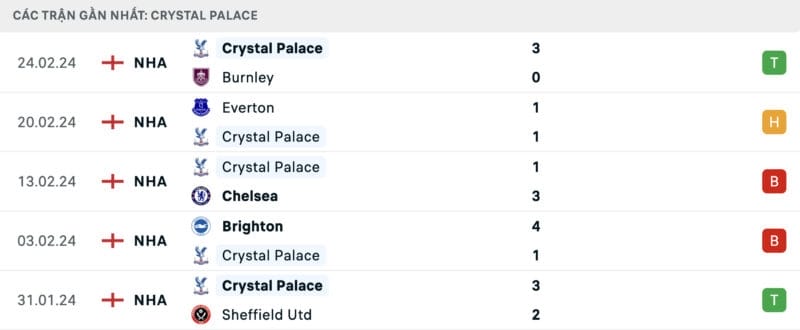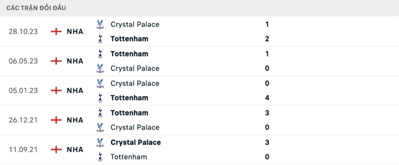 Thành tích đối đầu Tottenham vs Crystal Palace