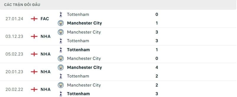 Thành tích đối đầu Tottenham vs Man City