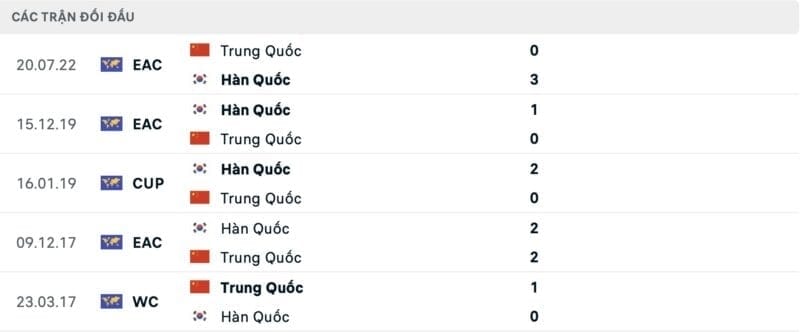 Thành tích đối đầu Trung Quốc vs Hàn Quốc: