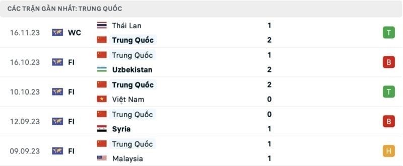 Phong độ gần đây Trung Quốc vs Hàn Quốc: