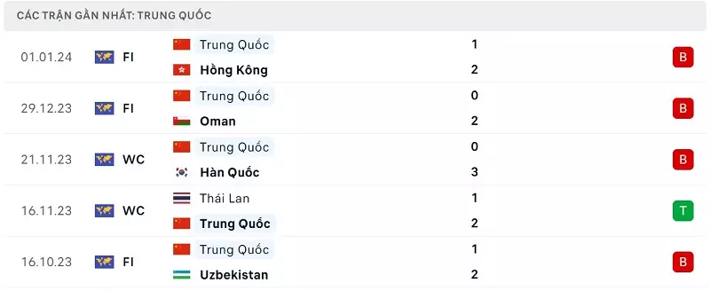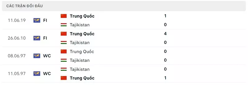 Thành tích đối đầu Trung Quốc vs Tajikistan: