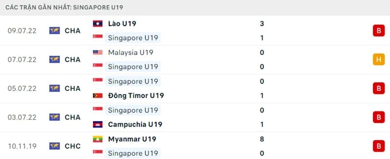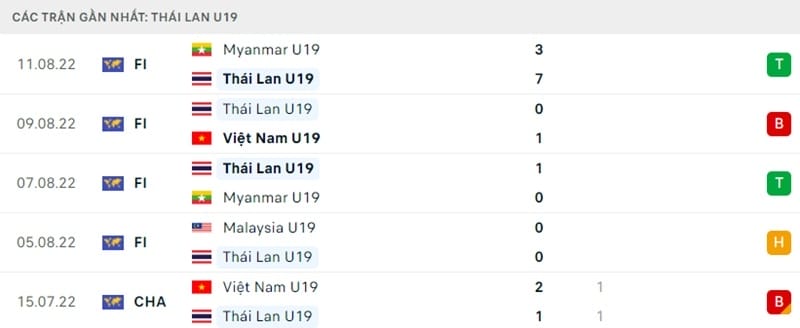 Phong độ gần đây U19 Thái Lan vs U19 Singapore