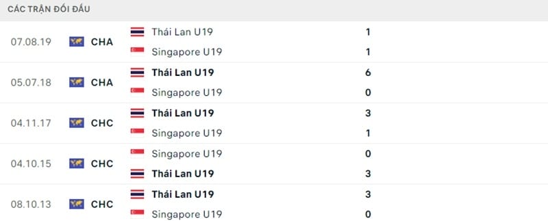 Thành tích đối đầu U19 Thái Lan vs U19 Singapore