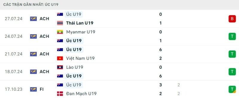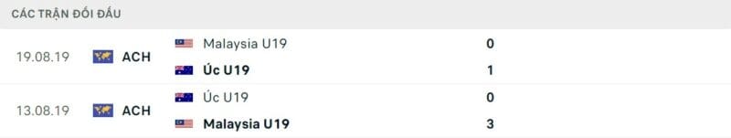 Thành tích đối đầu U19 Úc vs U19 Malaysia