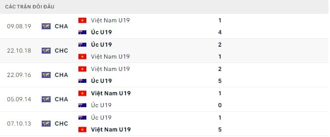Thành tích đối đầu U19 Úc vs U19 Việt Nam