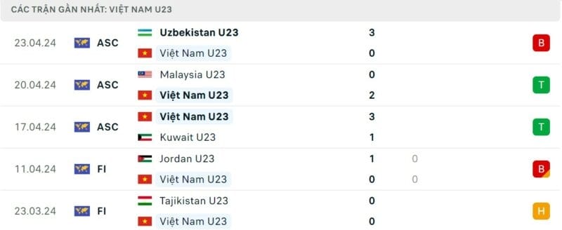 Phong độ gần đây U23 Iraq vs U23 Việt Nam