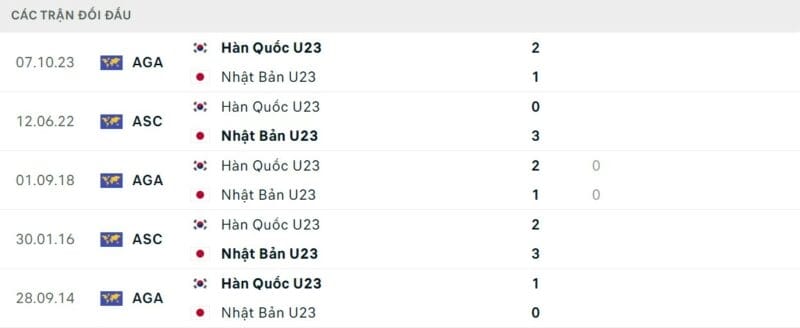 Thành tích đối đầu U23 Nhật Bản vs U23 Hàn Quốc