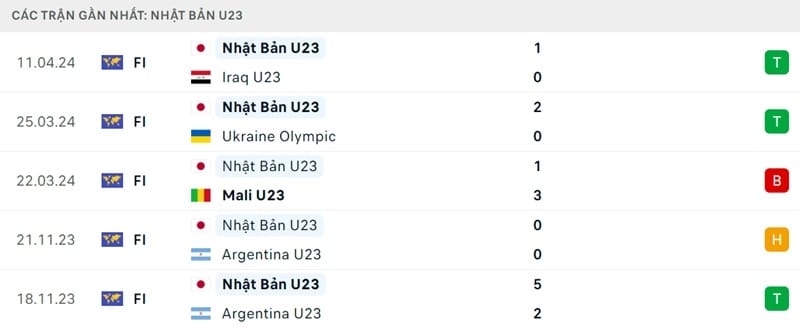 Xét 5 trận đấu gần nhất, thầy trò Oiwa Go sở hữu 3 chiến thắng, 1 hòa và 1 trận thua. Trong đó, có cả những trận đấu ấn tượng với các đội bóng mạnh như U23 Argentina hay U23 Iraq. Việc thử lửa với nhiều nền bóng đá khác nhau giúp U23 Nhật Bản trau dồi bản thân rất nhiều.
