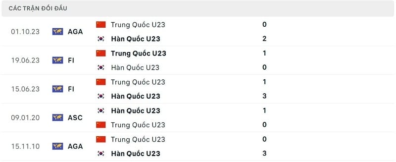 Thành tích đối đầu U23 Trung Quốc vs U23 Hàn Quốc