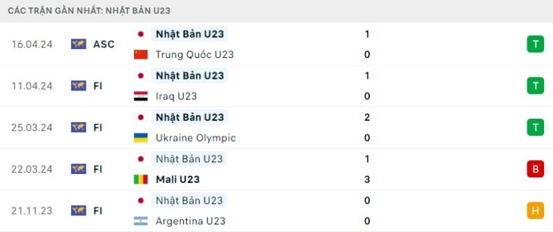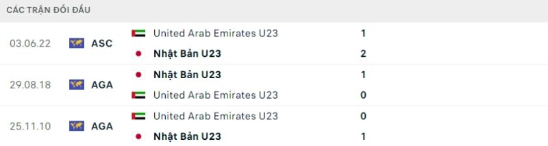 Thành tích đối đầu U23 UAE vs U23 Nhật Bản