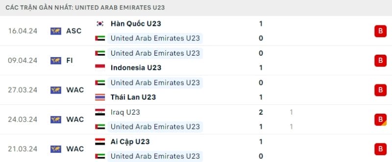 Họ đang đối diện với nguy cơ bị loại ngay ở lượt đấu thứ 2, khi phải đụng độ với ông kẹ Nhật Bản. Phong độ của U23 UAE là điều khiến mọi cổ động viên Tây Á lo lắng, khi họ toàn thua cả 4 trận đấu gần nhất. Họ cũng không thể thắng U23 Nhật Bản ở 3 lần đụng độ vừa qua, trong đó có 2 thất bại.