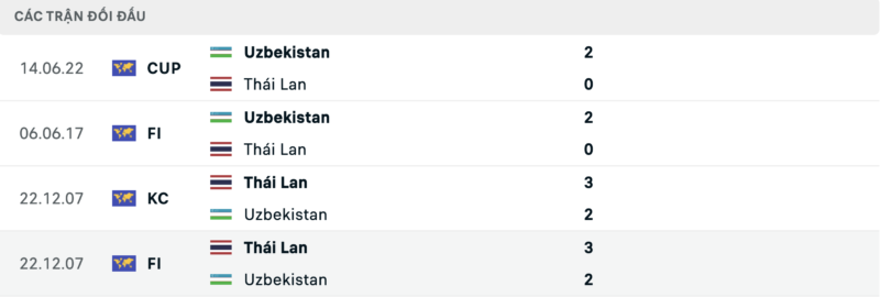 Thành tích đối đầu Uzbekistan vs Thái Lan