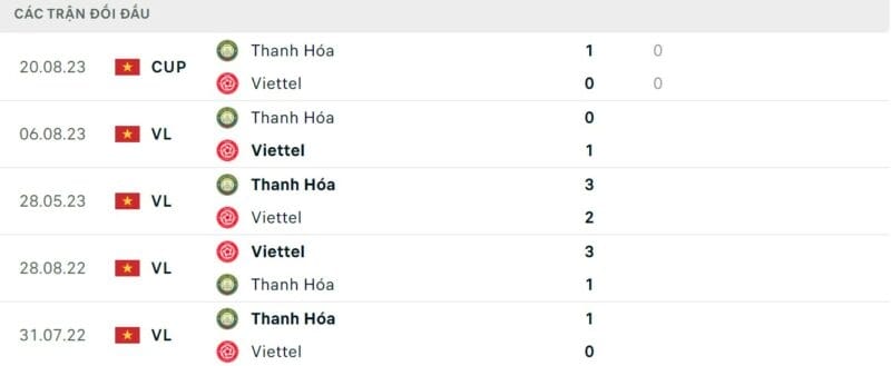 Thành tích đối đầu Viettel vs Thanh Hóa: