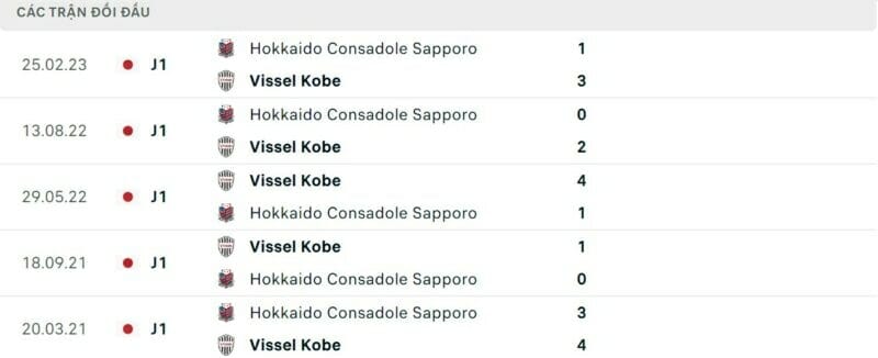 Thành tích đối đầu Vissel Kobe vs Hokkaido Consadole Sapporo: