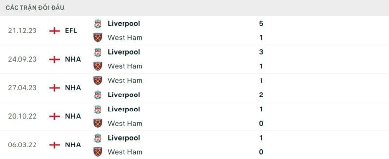 Thành tích đối đầu West Ham vs Liverpool