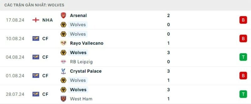 Phong độ gần đây Wolves vs Chelsea