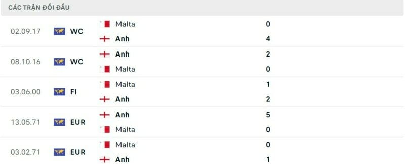 Thành tích đối đầu Malta vs Anh: