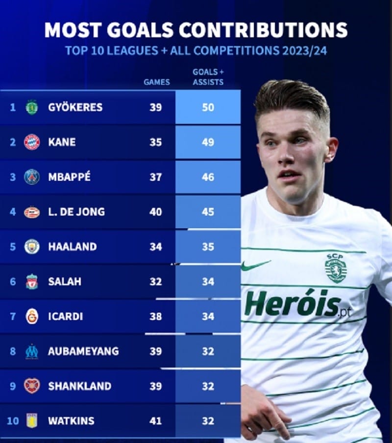 Theo thống kê từ Transfermarkt, Viktor Gyokeres đang là tiền đạo góp dấu giày vào nhiều bàn thắng nhất trong top 10 giải VĐQG hàng đầu châu Âu (50 bàn). Cầu thủ người Thụy Điển tham gia vào 1,41 bàn thắng mỗi 90 phút trên mọi đấu trường.