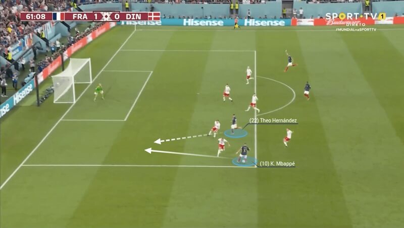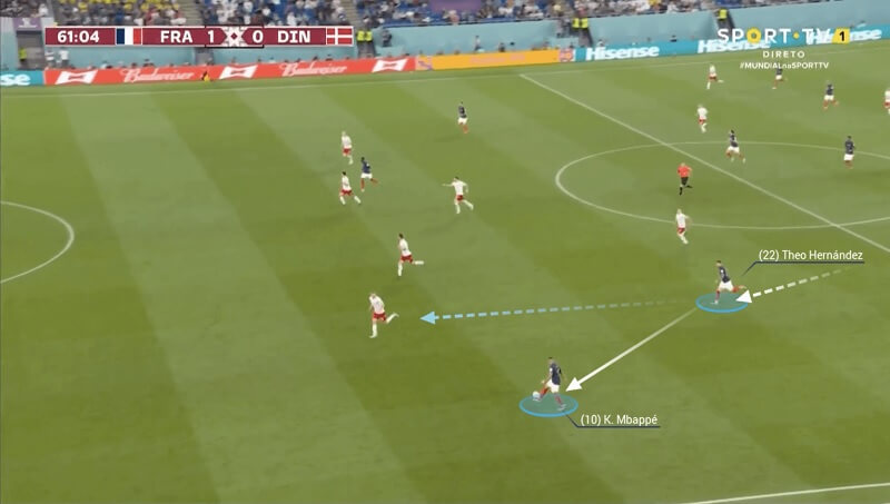 Trong trận gặp Đan Mạch, chính Theo cùng Mbappe đã phối hợp ăn ý, từ đó xé lưới đối thủ. Nhận đường chuyền chuyển cánh từ Aurelien Tchouameni, hậu vệ mang áo số 22 đẩy nó tới chỗ Mbappe rồi tăng tốc mạnh mẽ về phía vùng cấm địa.