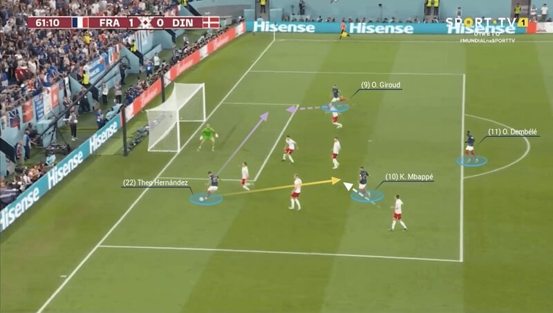 ... và Theo, thay vì căng ngang cho Giroud (mũi tên màu tím), đã nhả ngược lại để Mbappe lập công (mũi tên màu vàng).
