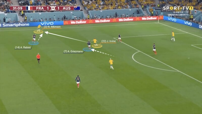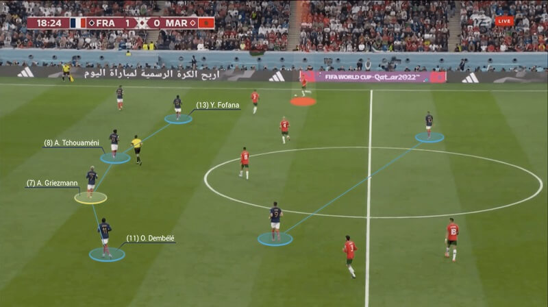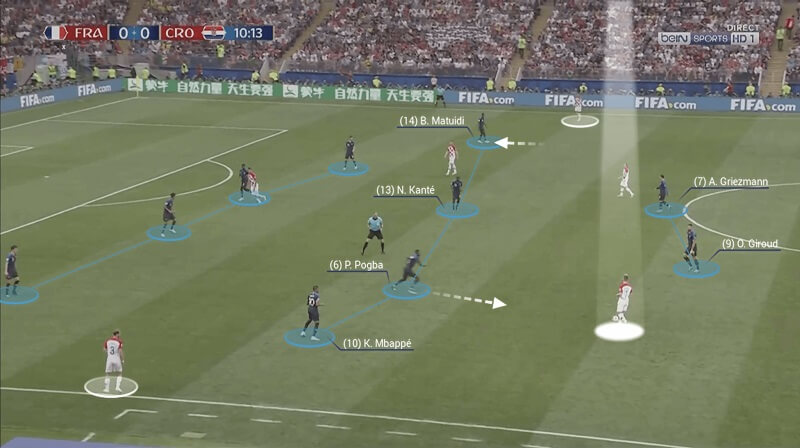 Trong chiến dịch trên đất Nga, Blaise Matuidi – một tiền vệ trung tâm, chơi vị trí chạy cánh trái để bù đắp khả năng phòng ngự cho Kylian Mbappe phía bên phải. Corentin Tolisso và Nabil Fekir cũng từng đảm trách vai trò tương tự.