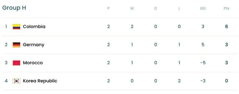 Cả 4 đội vẫn có thể đi tiếp, kể cả Hàn Quốc mặc dù không có điểm nào cho tới lúc này. Tuy vậy, 2 tấm vé đi tiếp khó thoát khỏi tay Colombia và Đức với điểm số và hiệu số cách biệt so với 2 đội còn lại.